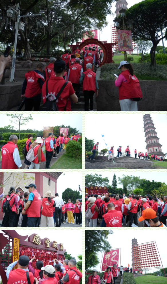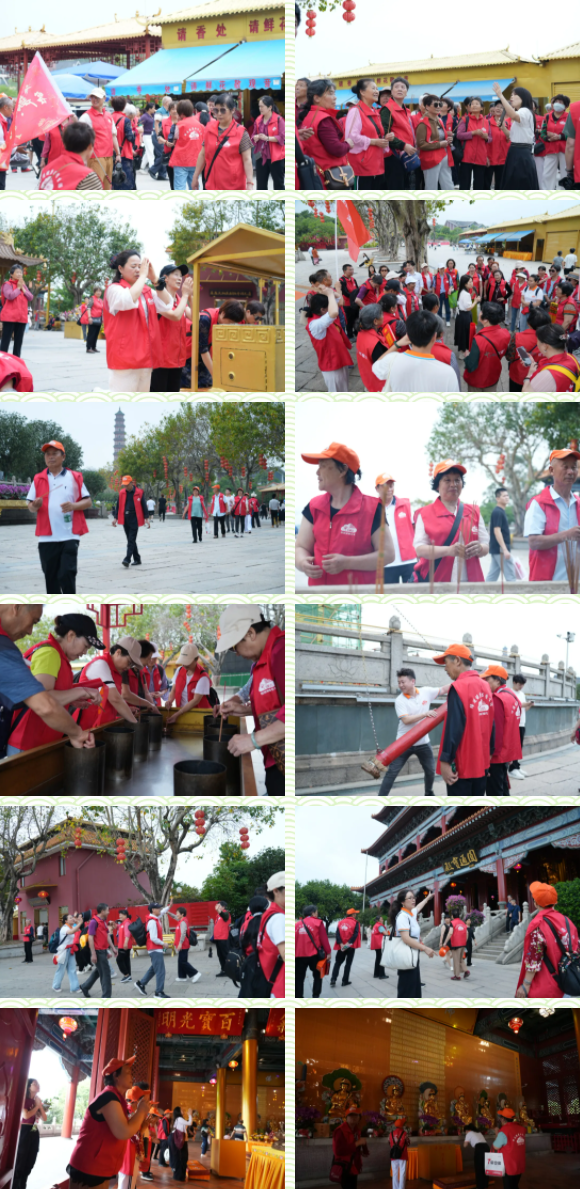 立于莲花山之巅的莲花峰,可将广州城景尽收眼底,都市繁华与山间静谧在此和谐相融;玉液池碧波如镜,倒映着葱郁山林,宛如遗落山间的翡翠;观音阁内香火缭绕,承载着无数祈愿与祝福。最令人震撼的当属望海观音铜立像——40.88米高的金身观音巍然屹立,阳光洒落,铜像熠熠生辉,庄重中透出慈悲。代表们虔诚祈福,愿健康与平安常伴亲友。